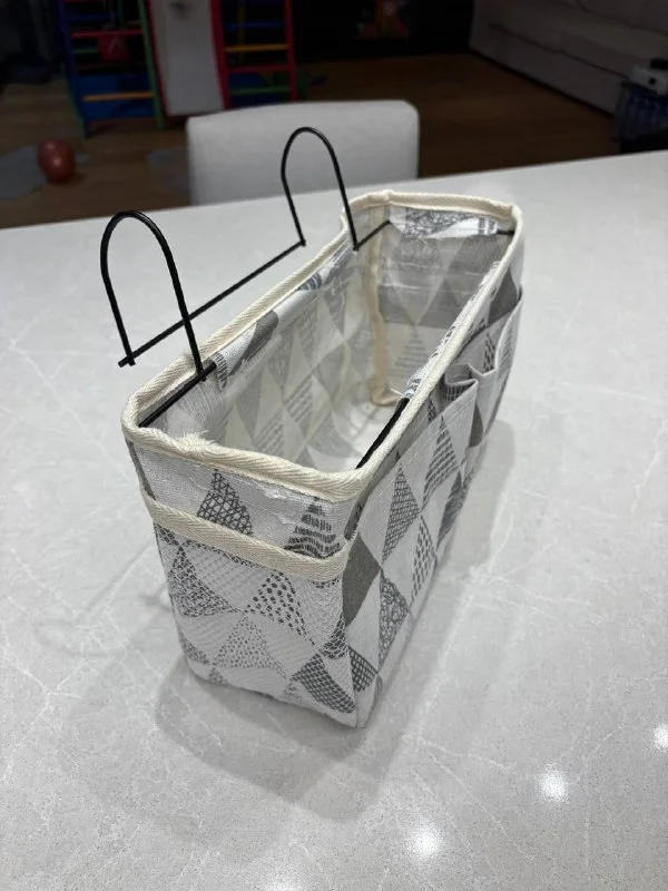 2) Органайзер подвесной (удобно повесить на изголовье/основание кровати или бортик детской кроватки, например. Тканевый, безкаркасный, форма держится за счет металлического прямоугольника вдетого по верхнему краю
