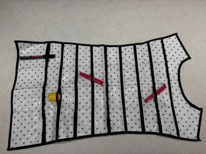 4) Органайзер подвесной с помощью вешалки. Множество кармашков для мелочей (удобно для косметики или украшений или резинок/заколок, впрочем можно и даже для лекарств или рукоделия). Несколько предметов положила в кармашки для наглядности