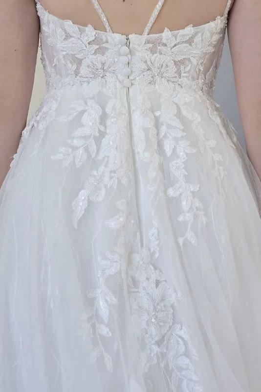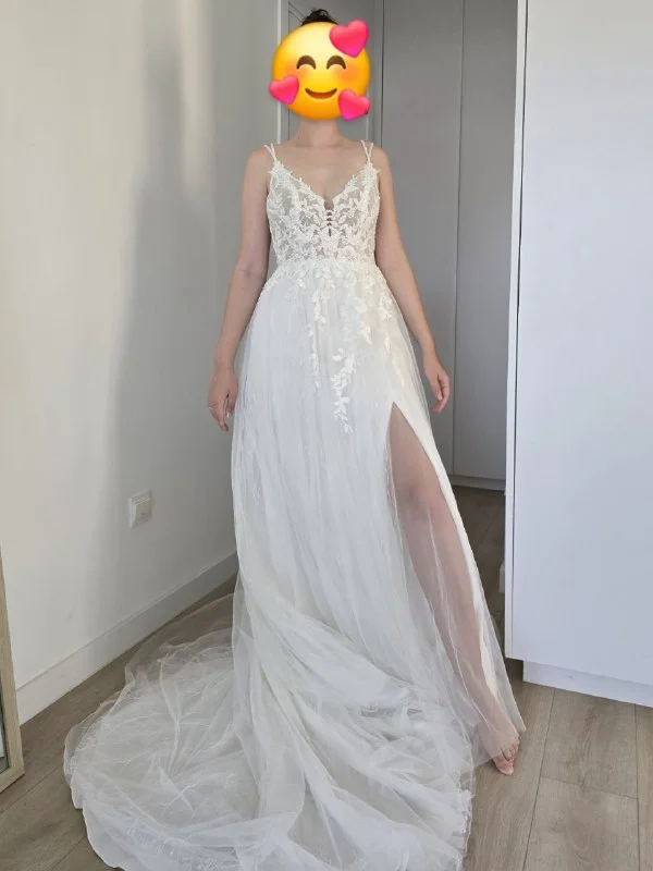 Features: High leg slit, open back, lace appliqué bodice, layered tulle skirt with wave patterns.