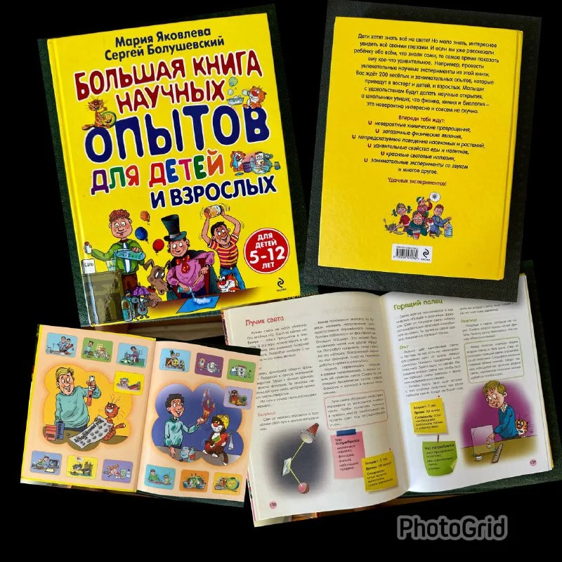 «Большая книга научных опытов» - большой формат 290*216*24, твёрдый переплёт, 280 стр, листы плотные. 200 весёлых и занимательных опытов. Подробно описаны и сами опыты и есть блок пояснений почему так происходит. 7€
