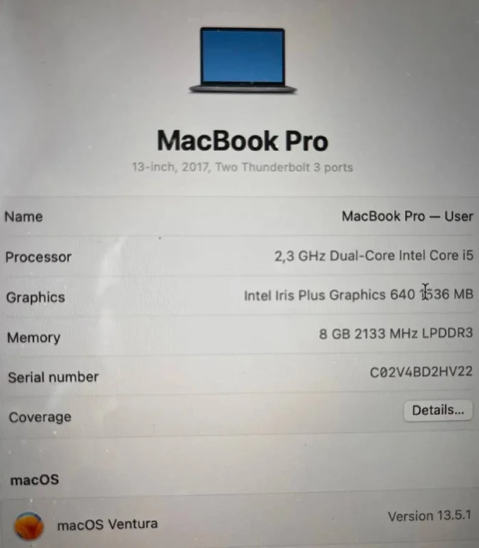 MacBook Pro 13 2017, Intel i5, 8 ГБ ОЗУ, 128 ГБ SSD.