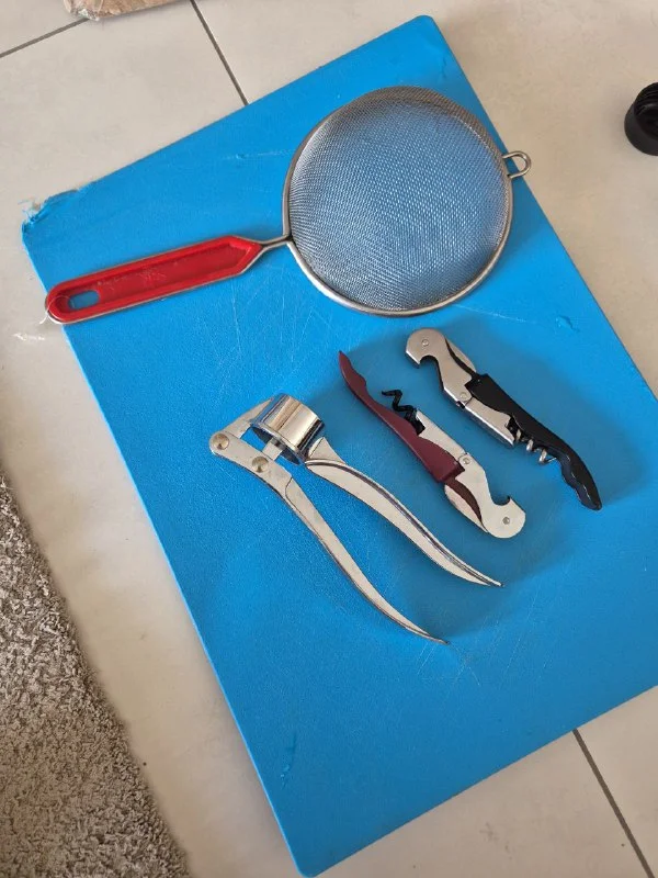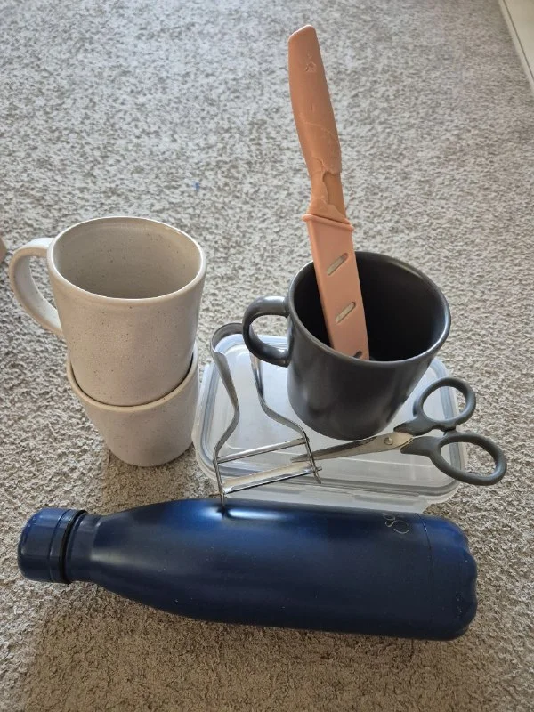 На первом фото (кружки, нож, ножницы, овощерезка, термос и контейнер) - за все 5€