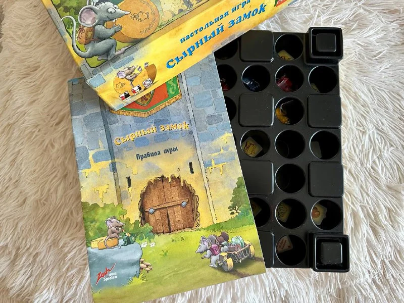 - Семейная настольная игра «Сырный замок». Тренирует память, пространственное мышление, учит запоминать нюансы и просчитывать действия противника. Новая.