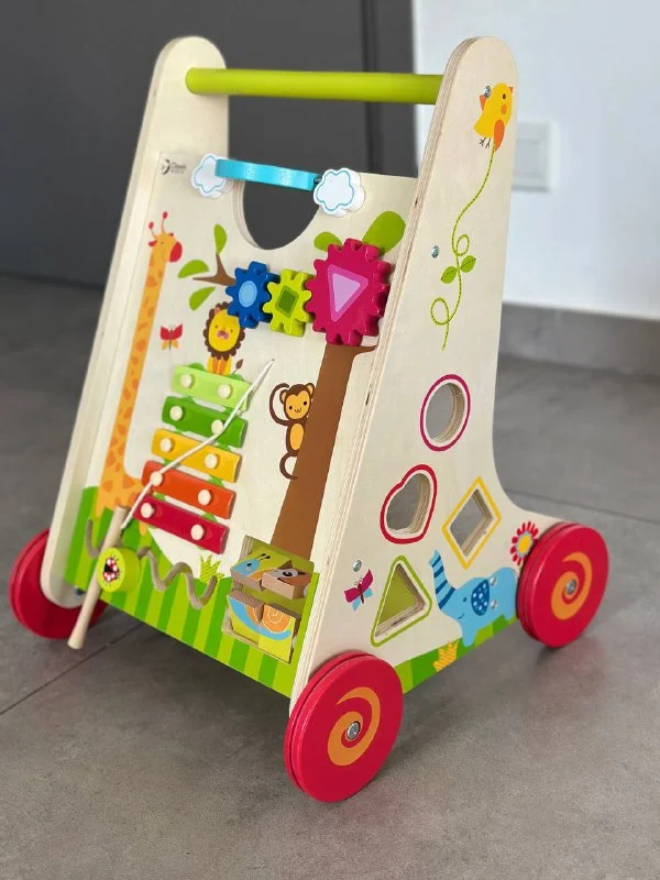 Деревянные ходунки с развивающими элементами: ксилофон, сортер, шестерёнки, пазлы, лабиринт. Состояние отличное.