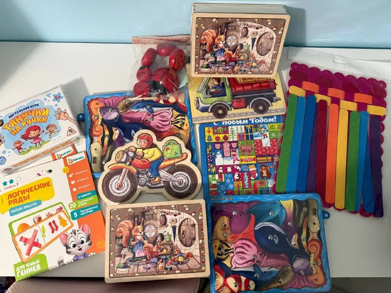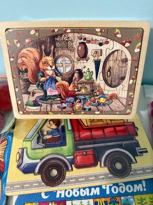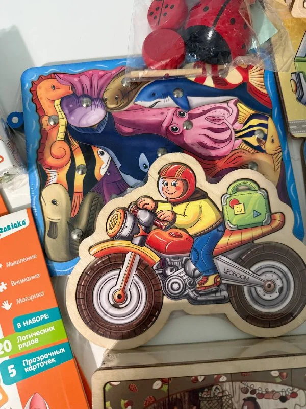 пазлы из фанеры - мотоцикл, машина, морские животные (она же магнитная рыбалка- 2 шт), животные (2шт) тетрис новогодний, игры на логику 2 шт (одинаковые), коврик для плетения, игра с резинками, деревяннА шнуровка божьи коровки из дерева, все новое