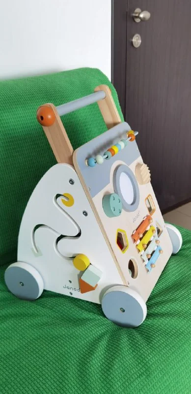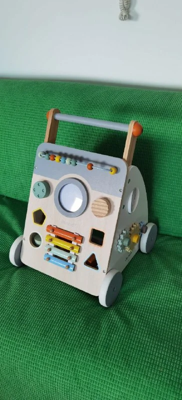 Многофункциональная тележка janod из натурального дерева, в пастельных тонах, 12+ (счеты, коробка с геометрическими фигурами, лабиринт, шестерни, поворотный переключатель со встроенным звуком, «скрежетающая» кнопка, увеличительное вращающееся зеркало, барабан и металлический ксилофон для развития музыкального слуха) в очень хорошем состоянии, 25 евро