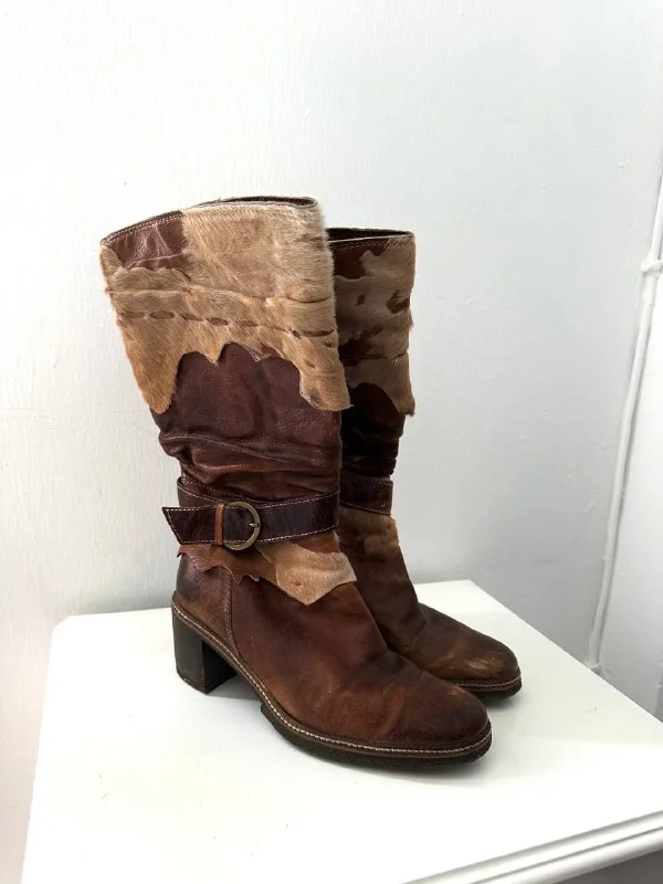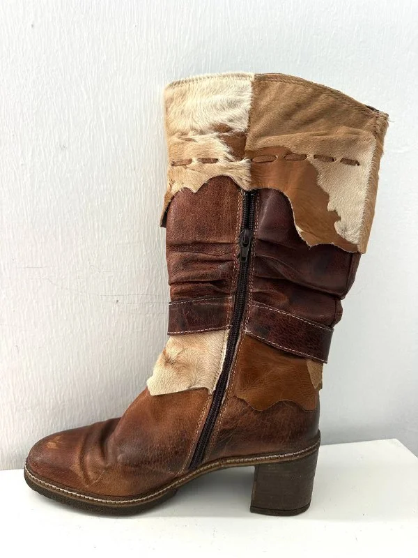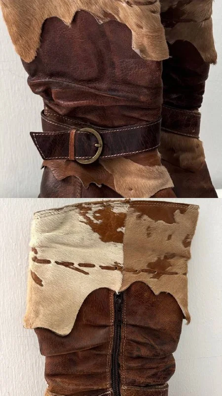 Дизайнерские сапоги из Италии, сочетают гладкую кожу коровы и натуральные участки коровьего меха в технике патчворк.