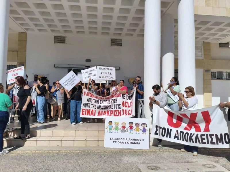 Banners and chants "no exclusion" outside the Ministry of Education. Mother Elpida Evripidou accuses the Ministry of misleading the public: the decision, she says, refers to sending her two children to a Special Unit because of disability characteristics and she calls that discriminatory. School implemented the ruling; the children stayed home. Yula Pitsiali of "Hug of Hope" says this is segregation, special units lack equal curricula and parents are pressured. Ministry director Giorgos Panteli says policy guarantees access, a special committee decided the children attend mainstream class and receive two individualized periods daily. Pitsiali says inclusive education has not progressed.