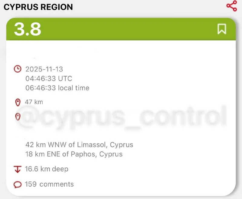 🌋 Новый толчок магнитудой 3.8 зафиксирован между Лимассолом и Пафосом. По данным Европейско-средиземноморского сейсмологического центра, эпицентр находился на глубине 16 километров. @cyprus_control