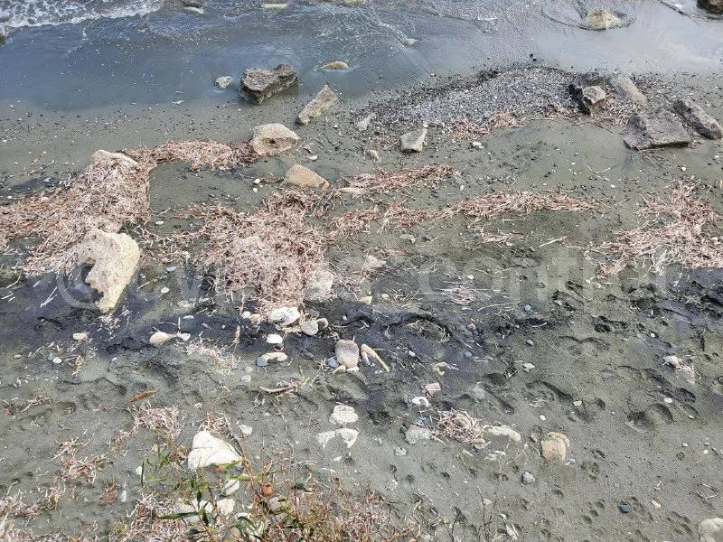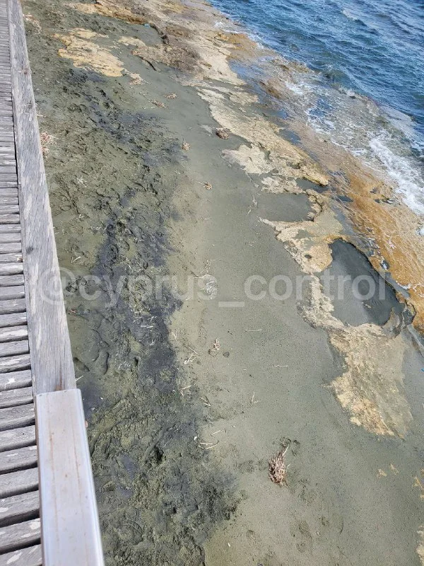 🌊 Жители сообщили о мазуте вдоль побережья Аматуса. Очевидцы прислали фотографии, сделанные во время прогулки по мостику напротив археологических раскопок, где вся линия берега оказалась покрыта масляными пятнами, а камни стали жёлто-чёрными.