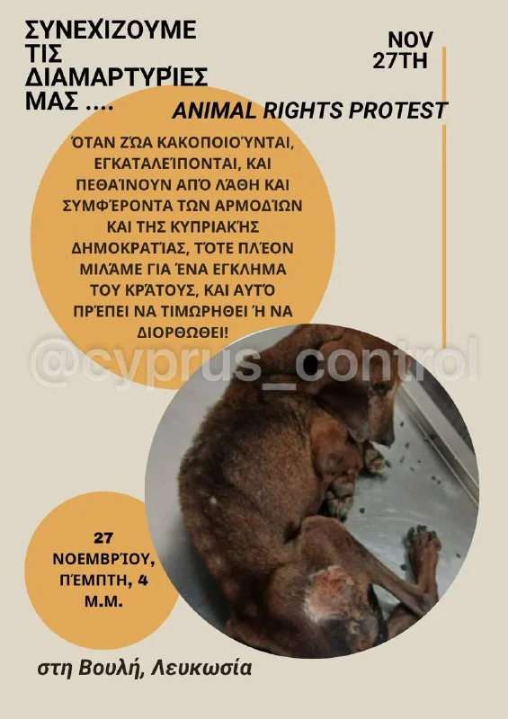 Организаторы заявляют, что ситуация с жестоким обращением и отсутствием решений достигла предела, поэтому люди собираются потребовать реальных мер. Тема защиты животных остаётся одной из самых болезненных для страны. @cyprus_control