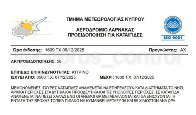 ⛈ В Республике Кипр действует новое жёлтое предупреждение из-за шторма Байрон.