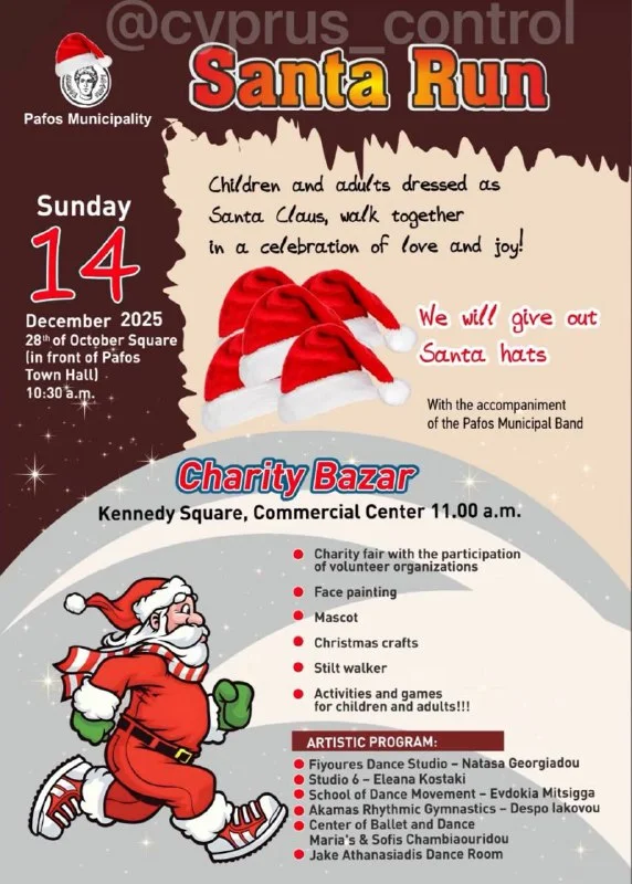 🎅 В Пафосе пройдёт праздничный забег Santa Run и благотворительный базар. В воскресенье 14 декабря в 10:30 на площади 28 Октября у мэрии дети и взрослые в костюмах Санта Клауса пройдут совместным праздничным маршрутом.