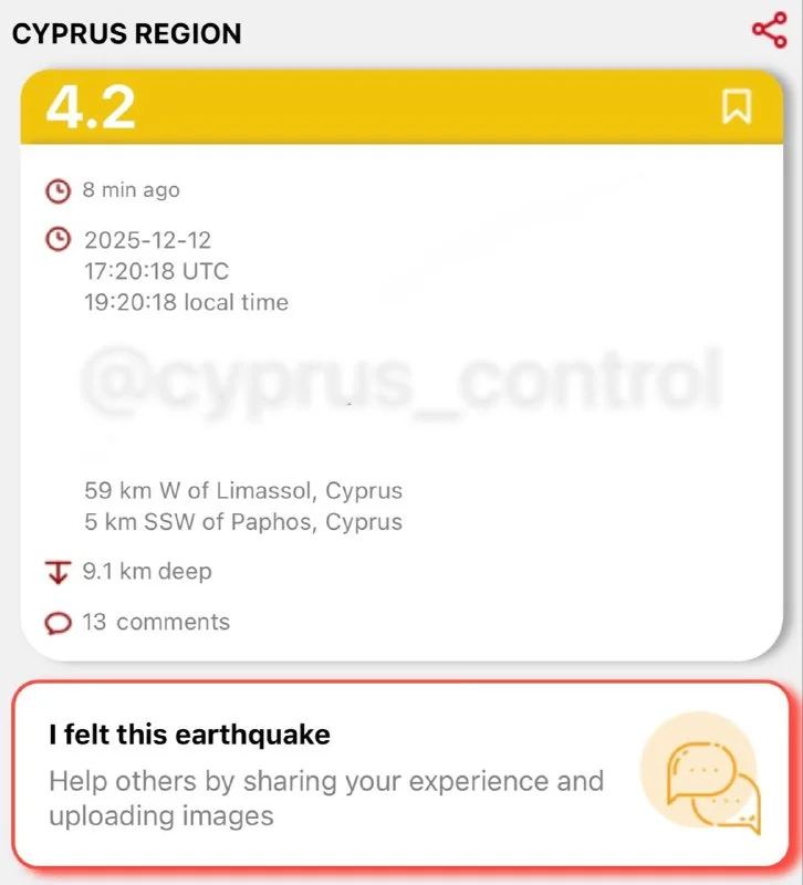 🌍 В районе Пафоса зафиксировано землетрясение магнитудой 4,2.