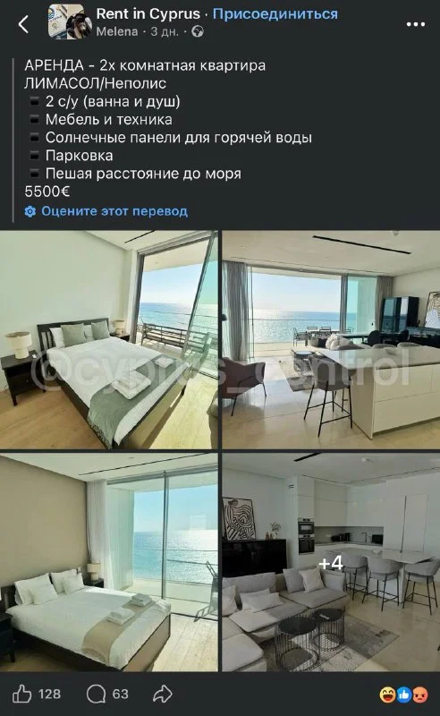 Объявление о сдаче двухкомнатной квартиры с видом на море в районе Неаполис спровоцировало волну комментариев и споров в Facebook, где пользователи массово раскритиковали цену, назвав её несоразмерной уровню доходов на острове и сравнивая с арендой в Дубае, Лос Анджелесе и европейских столицах.