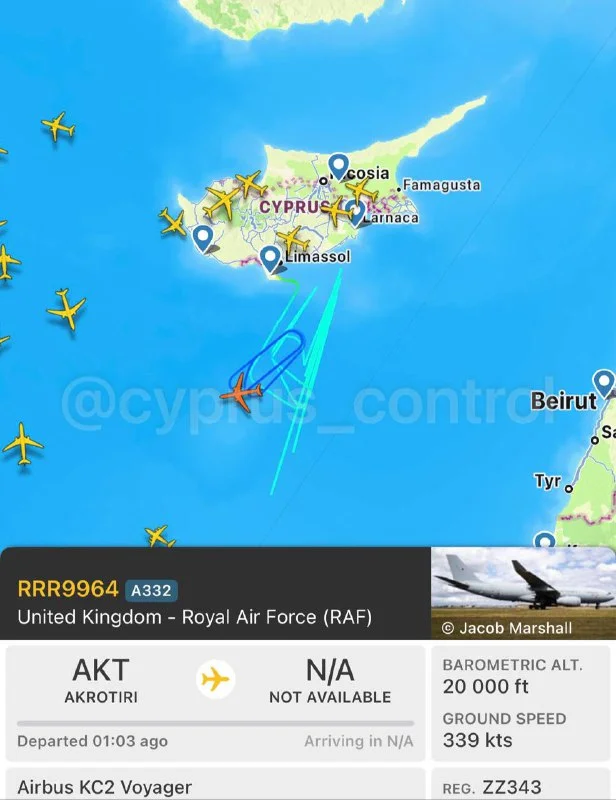 ✈️ Британский военный самолёт патрулирует у побережья Лимассола. По данным сервиса отслеживания полётов, борт Airbus KC2 Voyager Королевских ВВС Великобритании вылетел с базы Акротири и выполнял круговые манёвры к югу от острова на высоте около 20.000 футов со скоростью 339 узлов.