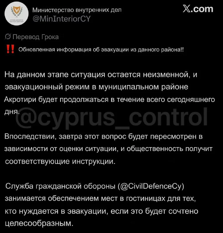 📲 Жителям Акротири направлено сообщение об обязательной эвакуации из-за угрозы безопасности. После повторного срабатывания сирен около 12:00 Министерство внутренних дел и Гражданская оборона разослали SMS с требованием немедленно покинуть район британских баз.