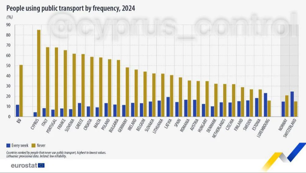 🚌 Кипр занял первое место в Европейском союзе по доле людей, не пользующихся общественным транспортом.