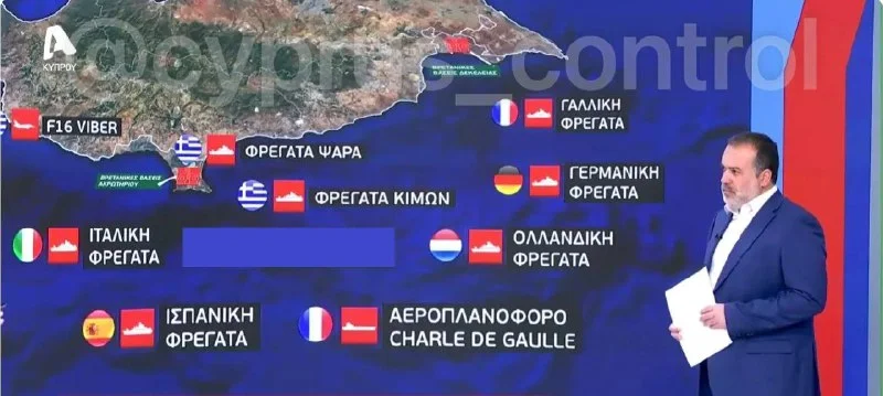 Южнее острова развернуты фрегаты и другие корабли, а центральным элементом группировки считается французский авианосец Charles de Gaulle с истребителями Rafale на борту. Сообщается, что греческие F-16, размещённые на авиабазе Андреас Папандреу в Пафосе, продолжают патрулировать воздушное пространство и участвуют в совместных учениях. @cyprus_control