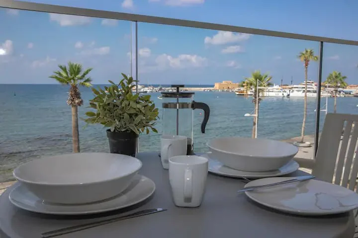 Из этой панорамной квартиры открывается вид на гавань и средневековый замок Пафоса.