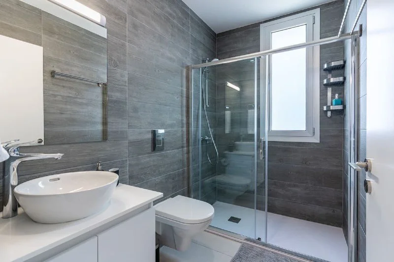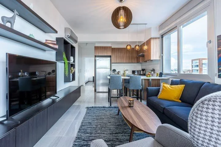 Гостиная с панорамными окнами и Smart TV, кухня с обеденной зоной и техникой. Спальня с двумя кроватями и ванной комнатой с душевой кабиной. Интерьер в светлых тонах с акцентами и современным декором.