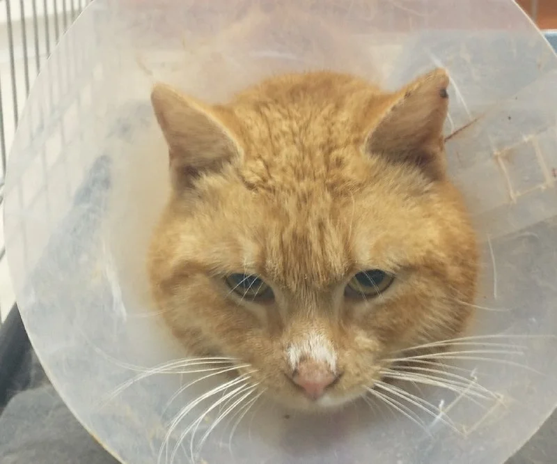 Он красивый рыже-белый мальчик, и мы уверены, что когда он поправится и снимет воротник, он будет просто великолепен 🐈 Очень надеемся, что со временем он немного привыкнет к людям.