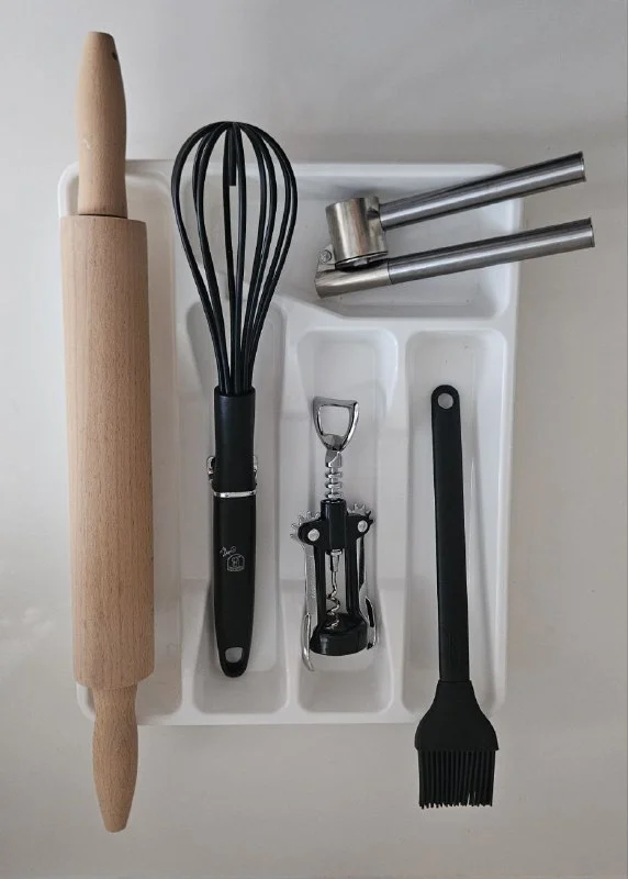 Набор кухонных инструментов: деревянная скалка, силиконовый венчик, штопор, силиконовая кулинарная кисточка, пресс для чеснока, металлическая тёрка, металлическое сито с ручками, ручная соковыжималка, две пластиковые воронки.