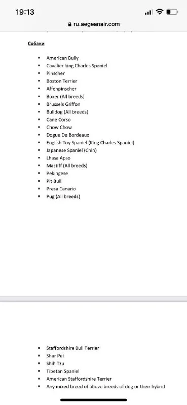 А кто-то летал Aegean с кавалером в салоне? Или с какой-то породой из этого списка? Немного настораживает формулировка на сайте, но вроде к перевозке в салоне этот список пород разрешён(а вернее запрещён только для багажного отсека)