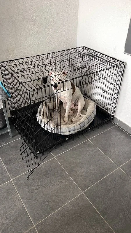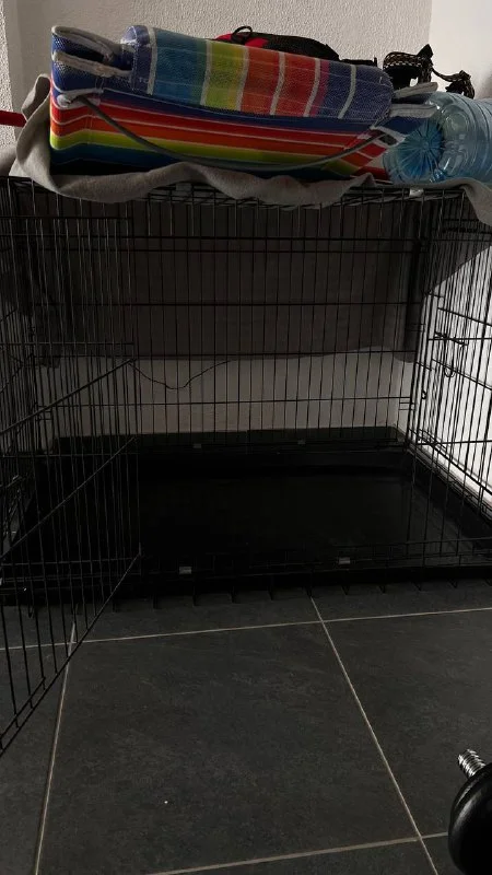 Продам черную, металлическую, складную клетку для крупных собак в отличном состоянии. Есть 2 выхода.